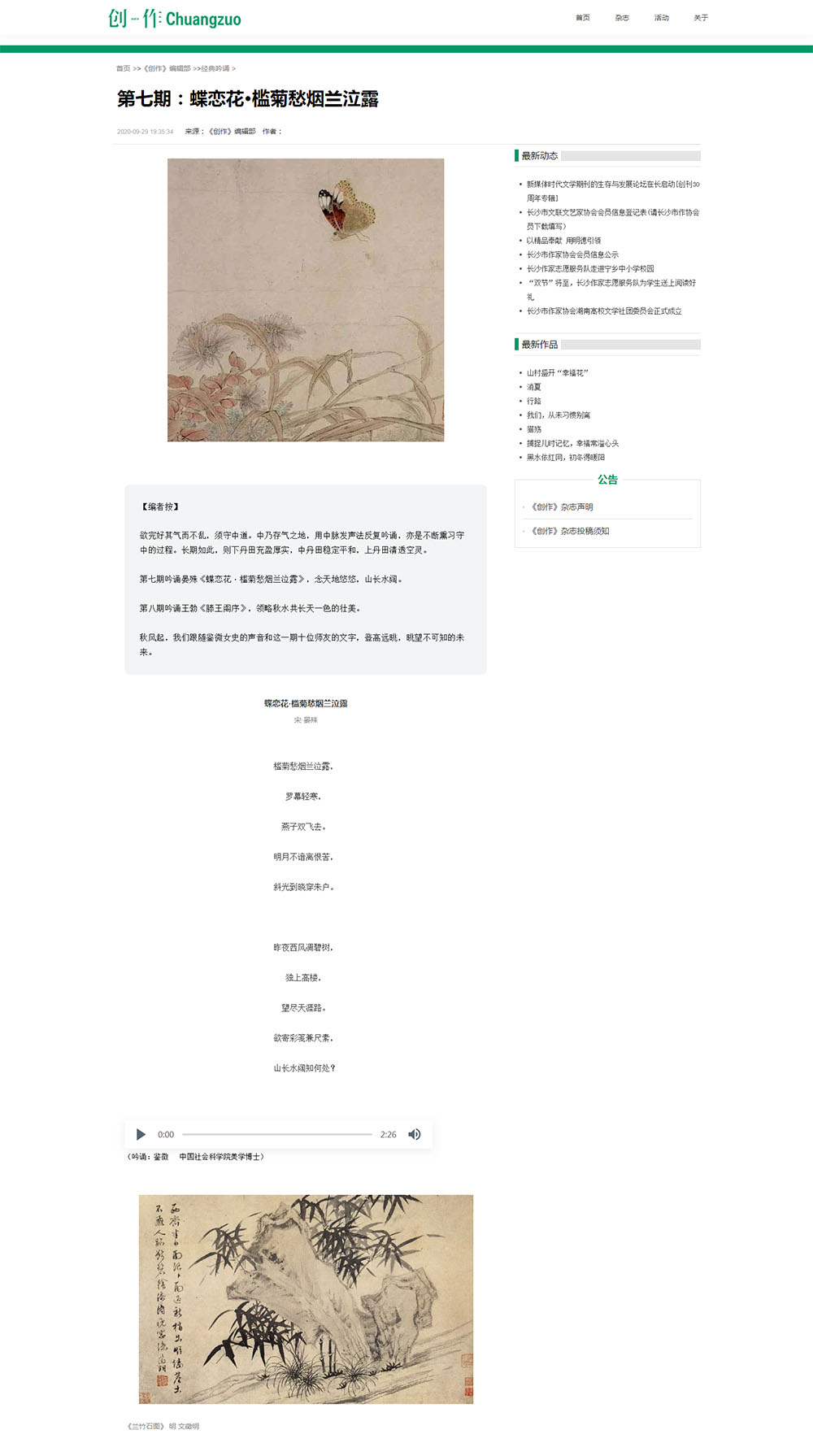《創(chuàng)作》雜志原名《新創(chuàng)作》,1982年創(chuàng)刊。是一家在國內(nèi)外公開發(fā)行的大型文學期刊,由中共長沙市委宣傳部主管,長沙市文聯(lián)主辦,擁有國際標準刊號( ISSN 1007-3876)、國內(nèi)統(tǒng)一刊號(CN43-1317/I)。2015年被國家新聞出版署評為“全國優(yōu)秀少兒報刊”?2016年榮獲湖南省“十佳”社科期刊?2018年榮獲第四屆“湖湘優(yōu)秀出版物獎”榮譽獎?由長沙市作協(xié)、《創(chuàng)作》雜志社組成的作家志愿服務隊送書籍雜志和文學講座到19所鄉(xiāng)村中小學,被長沙市文明委評為2018年度長沙市優(yōu) 秀文化志愿服務團隊。