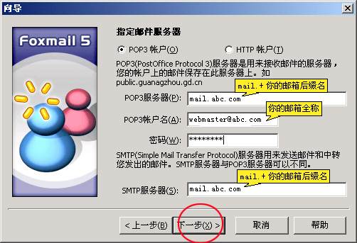 (4) 如果是接郵箱是。確認(rèn)你正確輸入密碼后。軟件還是提示你輸入密碼不正確請(qǐng)檢查第13步(在POP3帳戶(hù)名那欄輸入你自己完整的郵箱帳號(hào)和密碼)如POP3帳戶(hù)名那欄輸入:(webmaster@abc.com你自己完整的郵箱帳)密碼(你自己郵箱密碼)