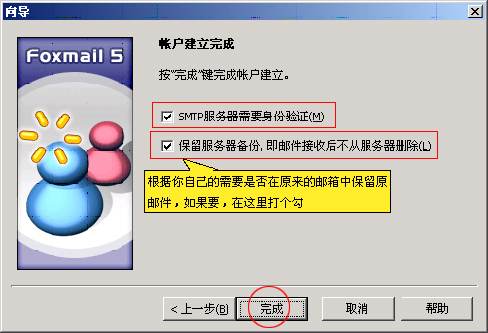 6、選中"SMTP身份驗(yàn)證",然后根據(jù)你自己的需要是否在原來(lái)的郵箱中保留原郵件,如果要,就在"保留服務(wù)器備份"這個(gè)可選項(xiàng)中打勾,接著按〈完成〉,界面如下: