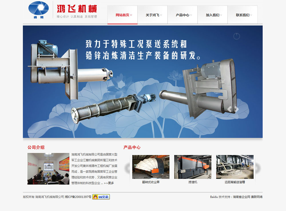 湖南鴻飛機械有限公司是由國營大型軍工企業(yè)江麓機械集團(tuán)所屬原三和技術(shù)開發(fā)公司兼并湘潭市工程機械廠發(fā)展而成,并且與長沙有色冶金設(shè)計研究院緊密合作。主要從事特殊工況泵送系統(tǒng)和鉛鋅冶煉清潔生產(chǎn)裝備的設(shè)計與制造,是一家產(chǎn)學(xué)研相結(jié)合的科技型企業(yè)。公司通過了ISO9001質(zhì)量體系認(rèn)證,并注冊了商標(biāo)“睿騰”。