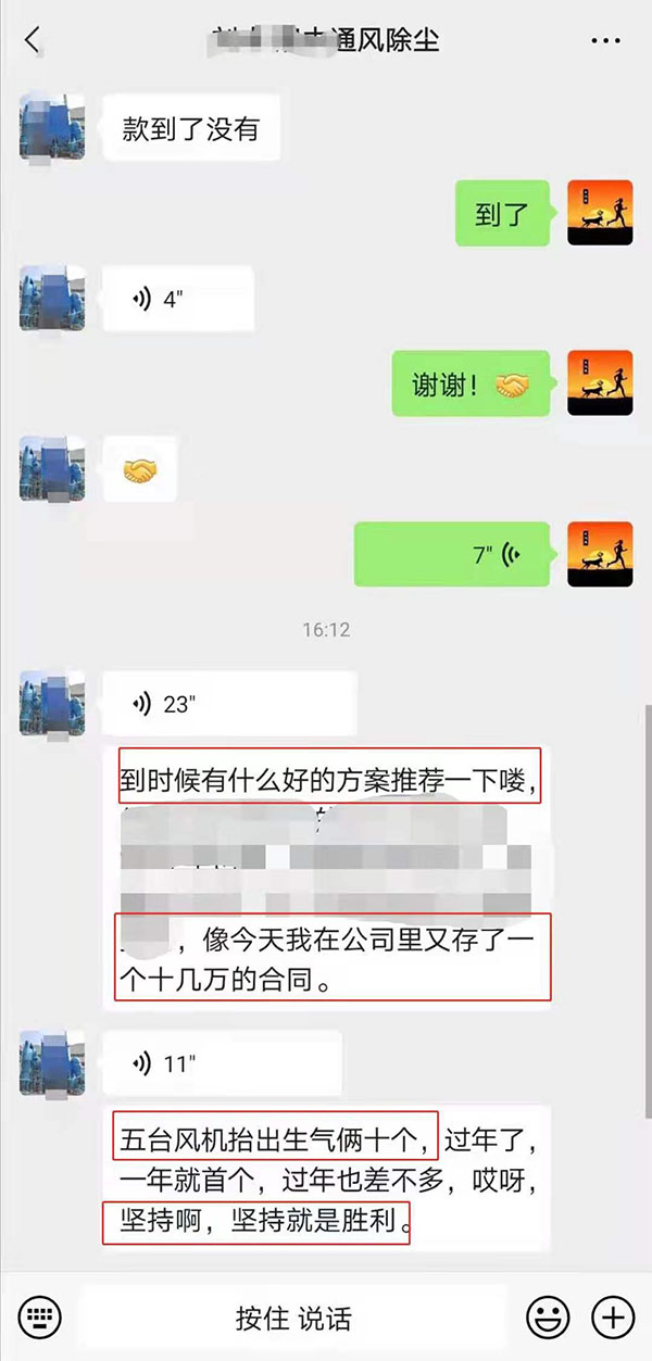 這不僅因?yàn)槔习逭\(chéng)信,還因?yàn)槔习褰裉煊趾灹藗€(gè)十多萬(wàn)的單子:5臺(tái)風(fēng)機(jī)1臺(tái)除塵器。(語(yǔ)音自動(dòng)轉(zhuǎn)文字略有不準(zhǔn))