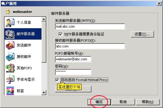 (4) 如果是接郵箱是。確認(rèn)你正確輸入密碼后。軟件還是提示你輸入密碼不正確請(qǐng)檢查第13步(在POP3帳戶(hù)名那欄輸入你自己完整的郵箱帳號(hào)和密碼)如POP3帳戶(hù)名那欄輸入:(webmaster@abc.com你自己完整的郵箱帳)密碼(你自己郵箱密碼)